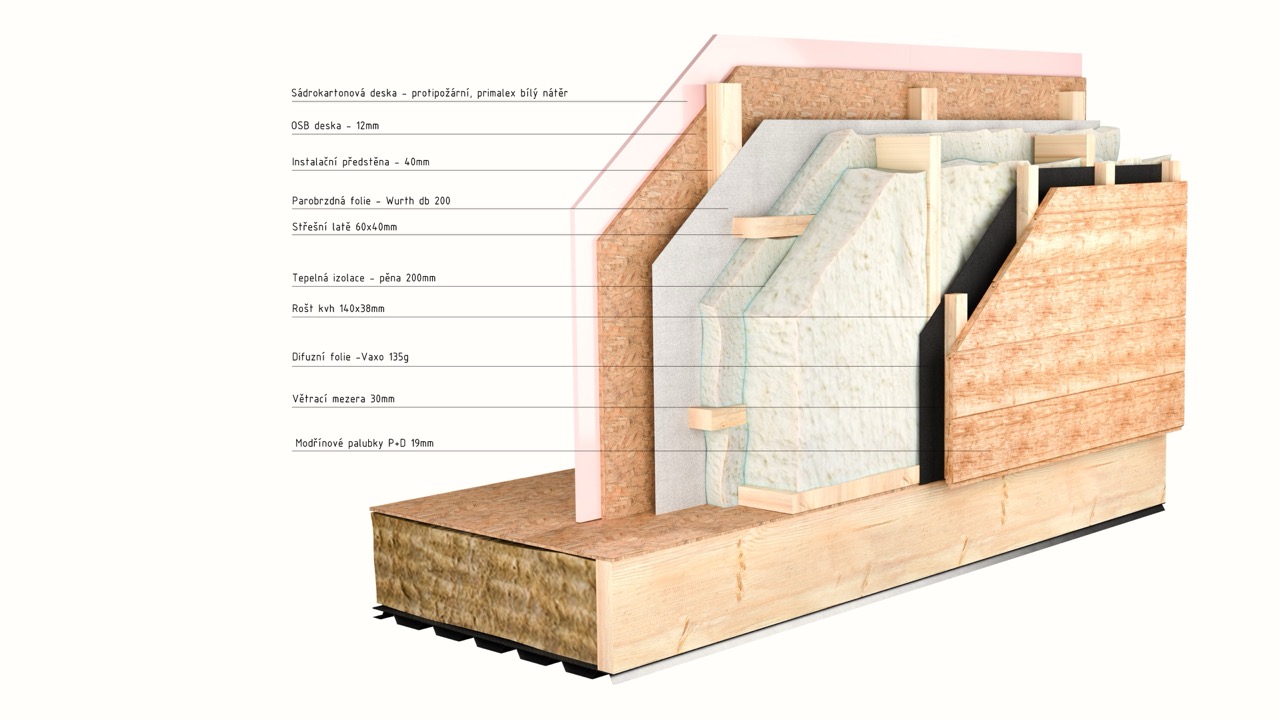 – Střecha zateplená stříkanou pěnou o síle 30 cm