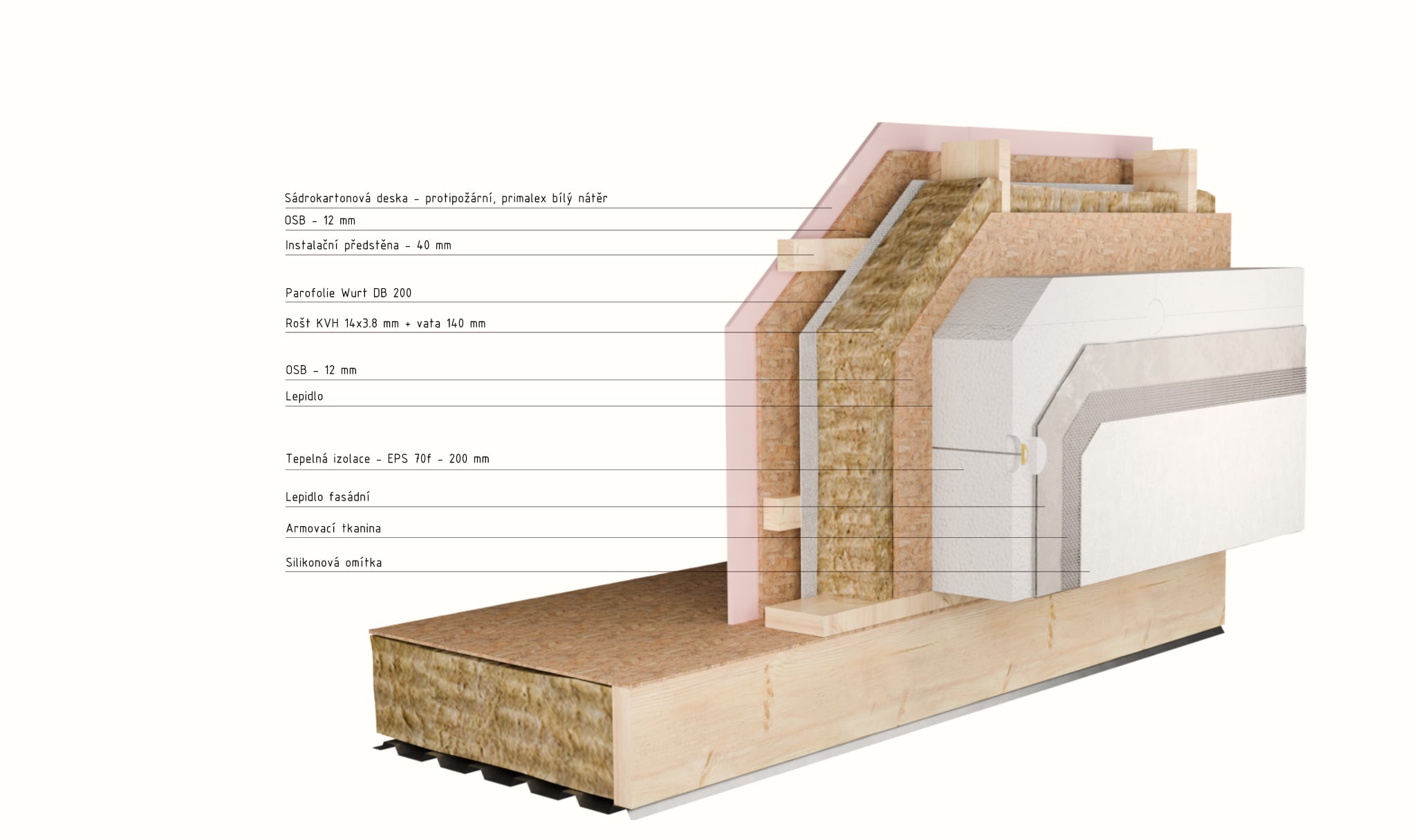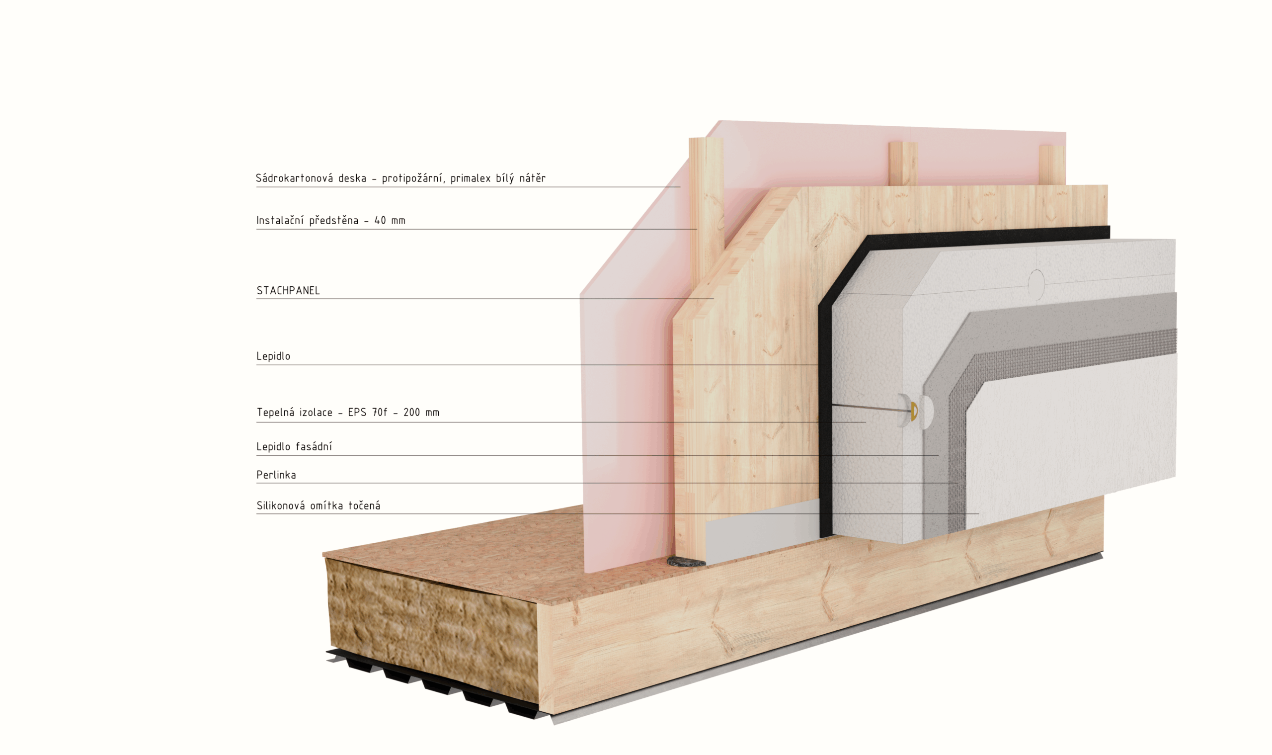 🏡 Fošnovou konstrukci 2″ by 4″ (vyplněno izolační vatou 14cm tl. -> celková tl. izolace 34cm) nebo z plných dřevěných panelů STACHPANEL + EPS 200mm a vnitřní příčky z rámové konstrukce vyplněné zvukovou izolací.